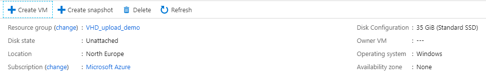 Once the upload is complete you can go to the Azure portal and see that it has created a managed disk as per the specified settings. This is ready to use now and can be attached to an existing VM or you can click Create VM and create a new VM using this OS disk.