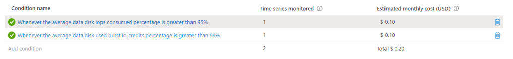 The two metrics I am using here are Average Data Disk IOPS Consumed Percentage and Average Data Disk Used Burst IO Credit Percentage. I decided to set the threshold at > 95% for the first one and > 99% for the second with an aggregation period and evaluation frequency of 5 minutes.