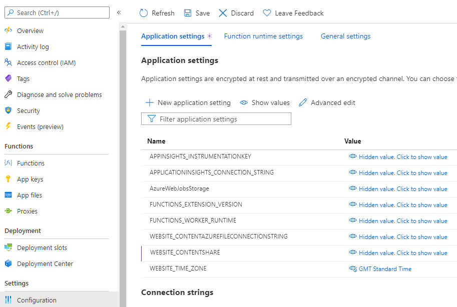 I am going to use a time based trigger to execute my function, so it’s very important to note that the default time zone used for the CRON expression in the next step will be UTC time. If you want use a different time zone then you must add an application setting to the function app called WEBSITE_TIME_ZONE. Remember to click the Save button to restart the app service.