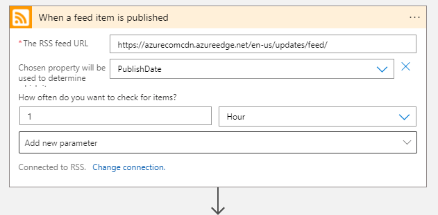 So our trigger will be When a feed item is published. This is pointed to the Azure Updates RSS feed URL and set to check every 1 hour.
