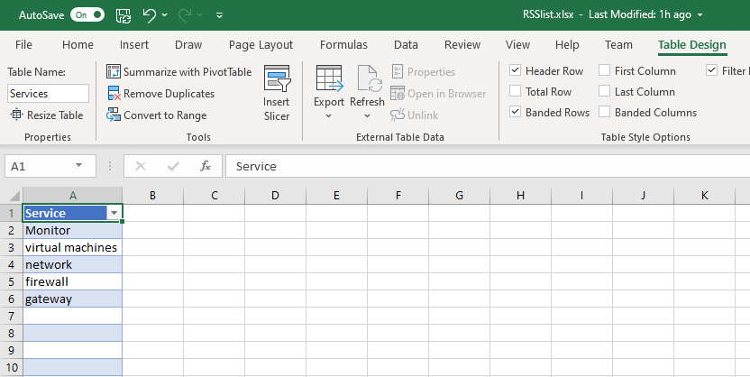 This is a very simple file that looks like the below. The important thing to note here is this must be a table within Excel, I called my table ‘Services’ and then listed some service keywords that I have an interest in. This list can then easily be modified any any point in the future.