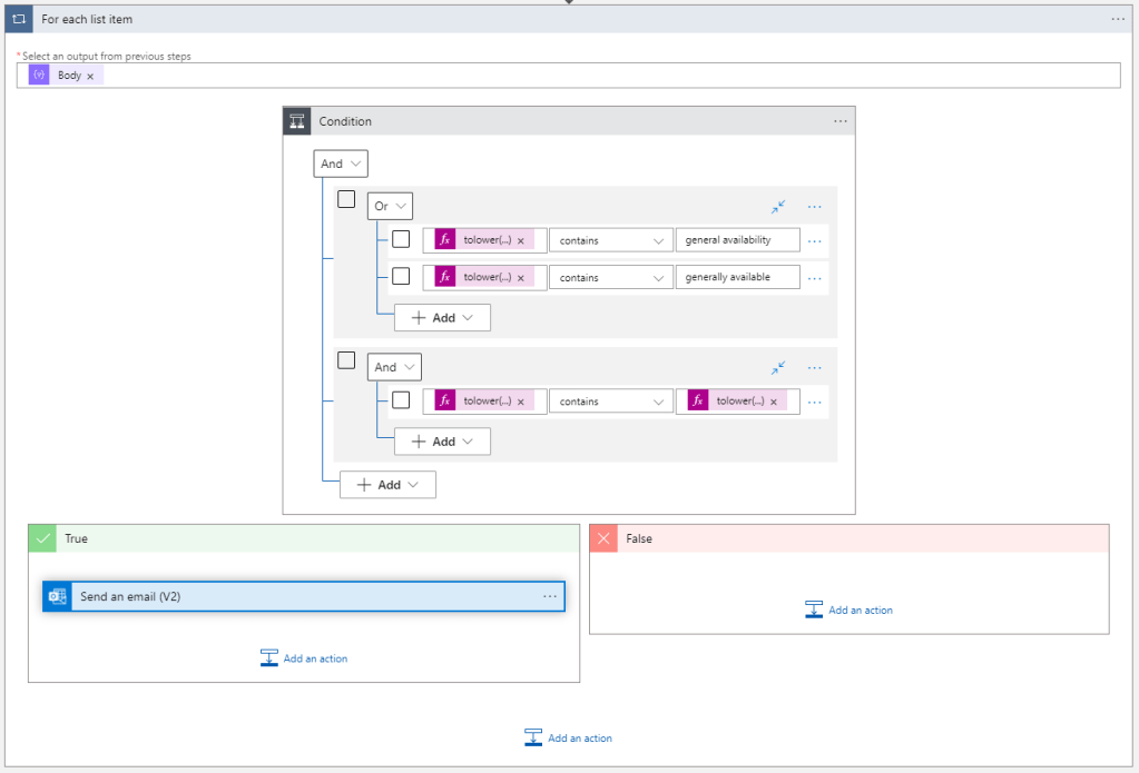 I have also included an additional sub-condition group to only select feed items that contain the words “general availability” or “generally available” in the title as I a want my notifications only to alert me when particular services have GA announcements. This group could easily be removed if not required.