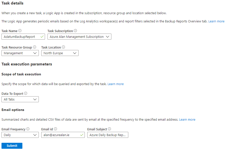 For those of you who still like to have a daily backup report emailed to you there is a feature for this here also. Enabling this feature will create a Logic App and some API connections. This should be deployed to your management tenant as it can then report on all of your delegated customer backups. Just remember to go into the API connections of the Logic App and authorise the API connections once the deployment has completed after you submit the task execution below.