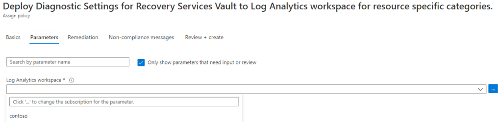 In the parameters section for this policy we will need to choose the Log Analytics workspace for the diagnostics logs to be sent to so make sure to choose the workspace on the customer tenant.