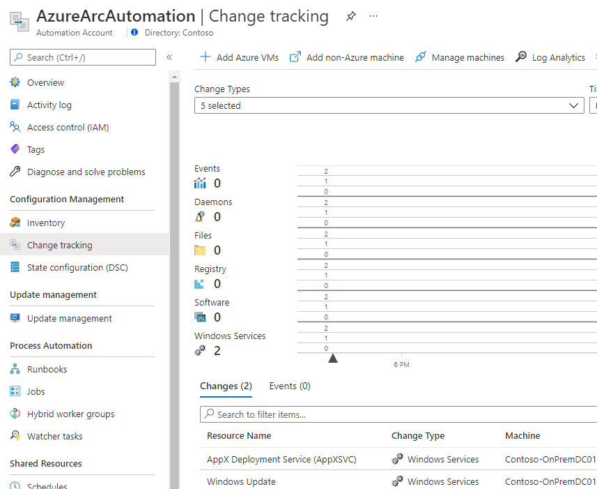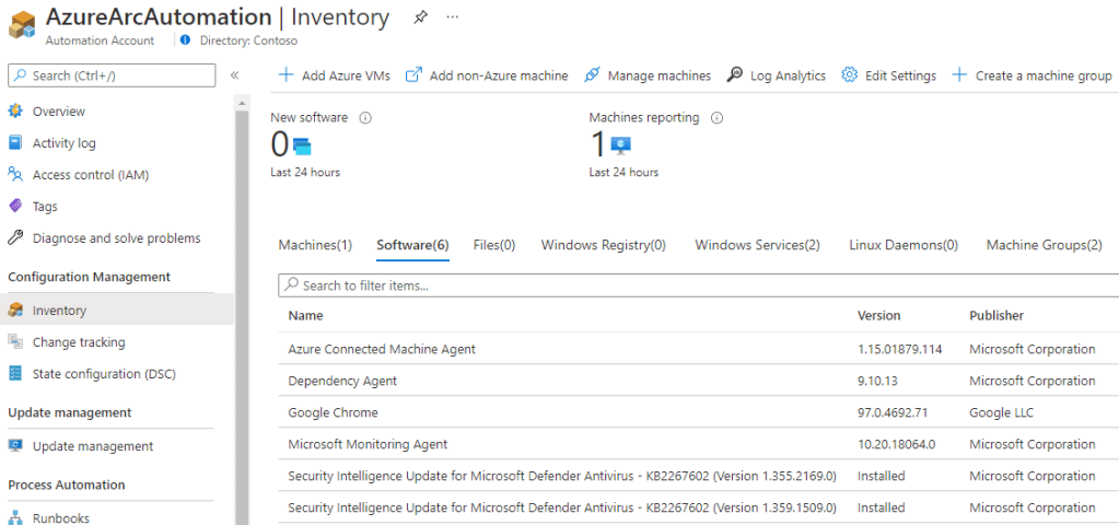 Let’s take a look at operations now. We will see here that we can use Azure Policy to apply governance for these servers just like we can with Azure Virtual Machines, we already covered Azure Policy in part 4 of this series. Instead, let’s focus on the next few options: Update management, inventory and change tracking and enable these features for our Azure Arc managed virtual machines.