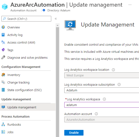 Once you have the Automation Account deployed, you can then enable update management, inventory and change tracking by enabling this feature and selecting the Log Analytics workspace that we have also used before in previous posts in this series for each of our customer tenants.