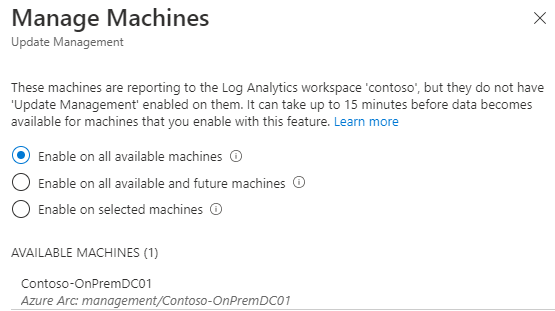 When update management is enabled and after some time has elapsed the Azure portal should detect that you have some machines that do not have update management enabled. It’s now simply a matter of setting the manage machines settings and deciding to either enable update management for all machines, selected machines or all and any future machines that are onboarded.