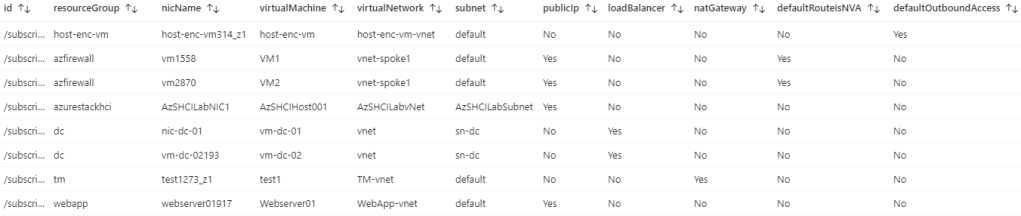 | project id, resourceGroup, nicName, virtualMachine, virtualNetwork, subnet, publicIp, loadBalancer, natGateway, defaultRouteisNVA, defaultOutboundAccess