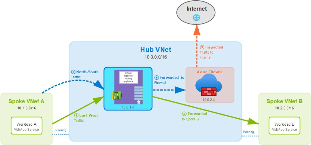 The AVNRA will then forward this traffic to spoke VNet B as it has learned this route through VNet peering; just make sure to add a return route back from VNet B to the AVNRA via its own route table. I can send all other unknown routes to my Azure Firewall (10.0.2.4) via a 0.0.0.0/0 default route; this ensures that all other traffic to unknown networks gets inspected by the firewall.