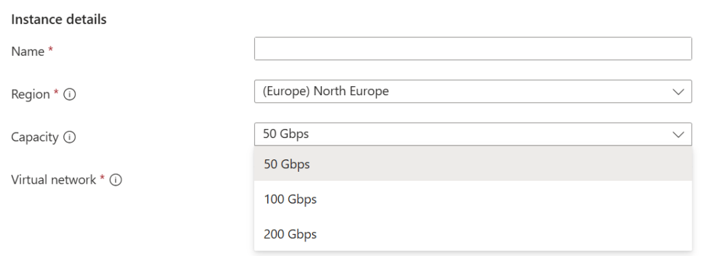 VirtualNetworkApplianceSubnet will need to be created. You must also choose the required capacity from the available options, presumably pricing will vary based on the required bandwidth. It’s currently free of charge while in public preview.