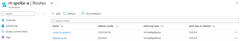 For example, my spoke VNet A does not know the route to spoke VNet B as it is not directly peered so I can add a route for VNet B’s address prefix and send it to the AVNRA as a next hop virtual appliance (10.0.0.4).