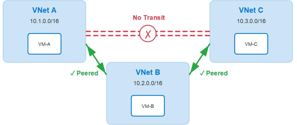In a nutshell, this is where Azure VNets that are not directly connected, cannot route to each other. In the example below, VNet B acts as the hub network with a VNet peering to all spoke networks. VNet B can route to all peered spoke VNets but they cannot route to each other as VNet peering is non-transitive by design. Instead, they must traverse the hub VNet and use a router of some kind that forwards the traffic to another network.